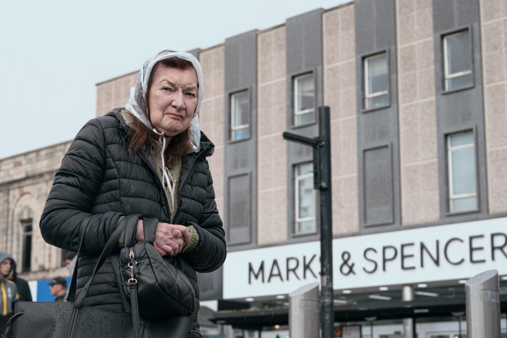 a woman bracing against the rain outside Marks & Spencer;