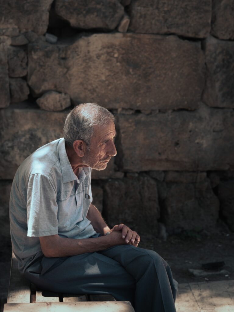 and elderly man sitting in the weight of his years.