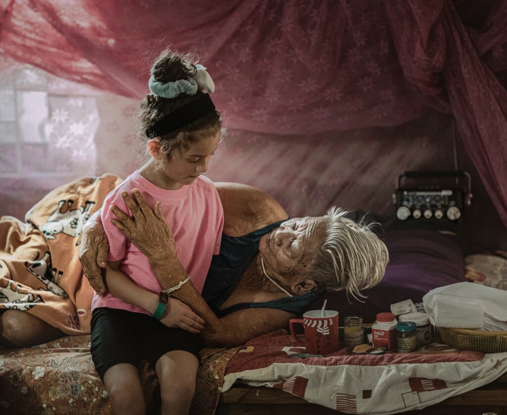 a grandmother lying in the last light of her life with a child beside her;